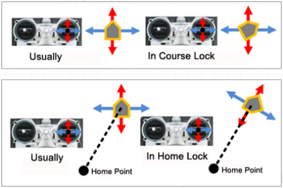 In course lock flying, the forward direction is the same as a recorded nose direction. See the following figures(Mode 1): In home lock flying, the forward direction is the same as the direction from home point to multi-rotor.See the following figures (Mode 2):